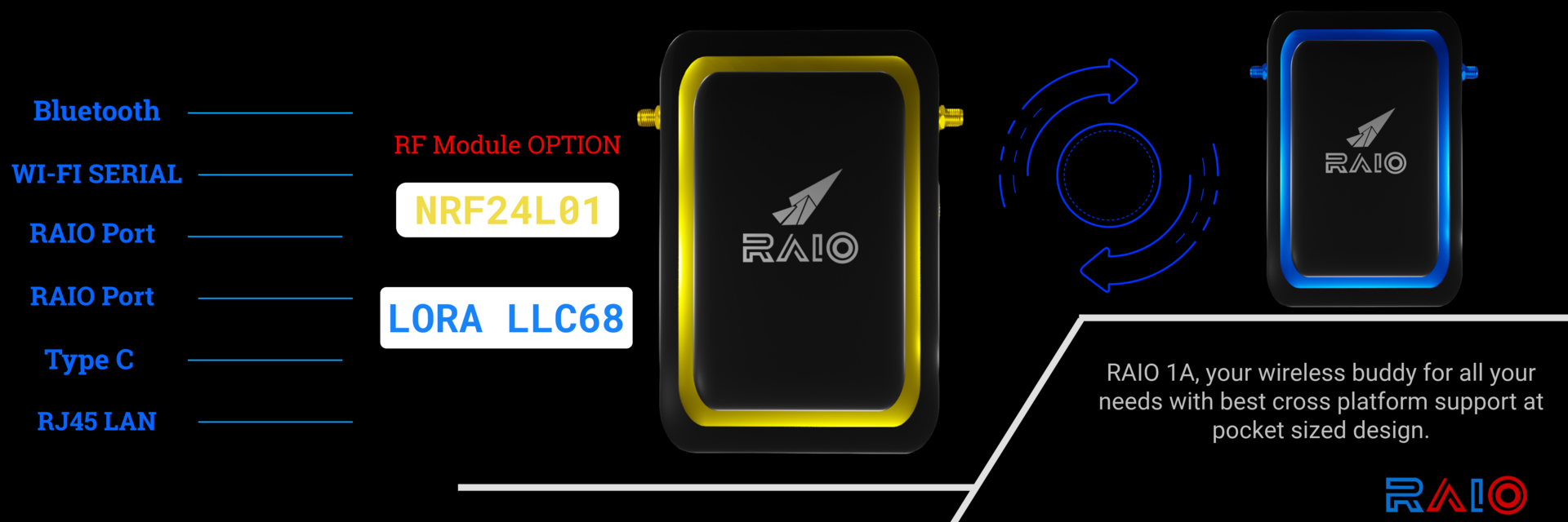 The Raio 1A is an advanced wireless device designed for robust data transmission over long distances. It features six serial ports—Bluetooth, Wi-Fi, USB Type-C, UART1, UART2, and I-MCU—allowing versatile connectivity. The device utilizes NRF24L01 and LoRa LLC68 radio chips, operating at 1 watt, enabling reliable data exchange: NRF24L01 supports full duplex at 100 kbps for distances up to 5 km, while LoRa can transmit half duplex at 62 kbps over distances of up to 10 km.